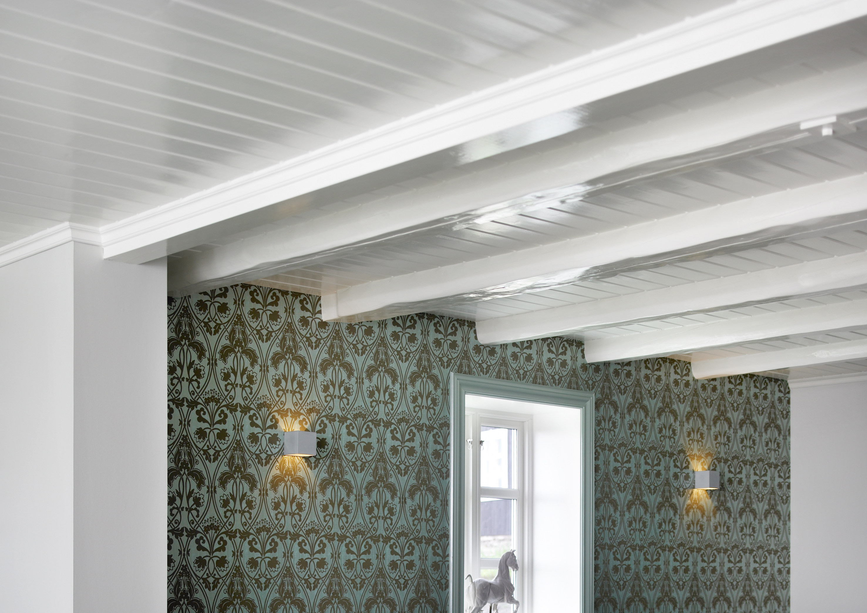 Har du panel i taket stiller saken seg litt annerledes. De fleste vil kanskje foretrekke matt, eller silkematt glans også her. Men hvorfor ikke la taket leve sitt eget liv med spill av reflekser? Vanlig takmatt har glansgrad 02.